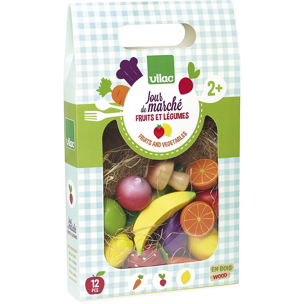 Set di frutta e verdura con cui i bambini possono giocare a fare i piccoli commercianti al mercato. Una graziosa scatola di cartone contiene carote, limoni, ravanelli, porri, melanzane, funghi champignon, pomodori, banane, mele, pere, fragole e due metà di arance. La frutta è in legno con accessori in feltro. Principali caratteristiche: adatto a ogni cucinaalimenti realizzati in legnocontiene 12 pezzi