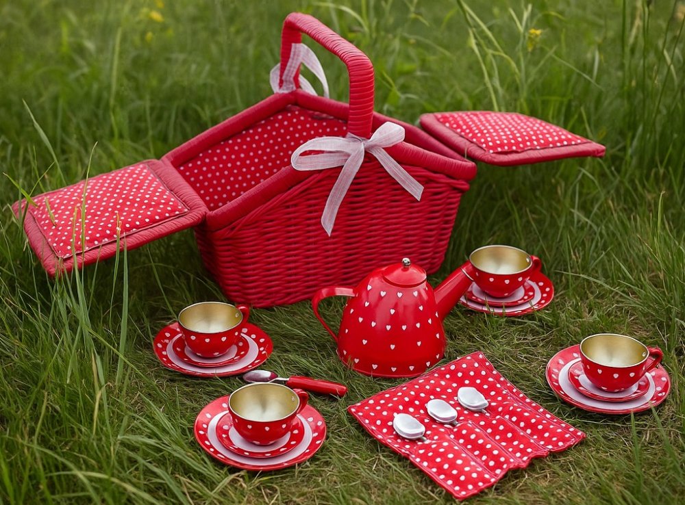 Questo cesto di vimini contenente un servizio da tè in latta con motivo a cuore è perfetto per ogni festa del tè! Il cesto ha cinghie con velcro, è foderato con tessuto a pois e decorato con piccoli nastri. Il set include: 1 cesto da picnic, 1 vassoio per posate, 1 teiera, 4 piatti grandi, 4 piatti piccoli, 4 tazze, 4 cucchiai Principali caratteristiche: Set da tè completo in cestocontiene 18 pezzi