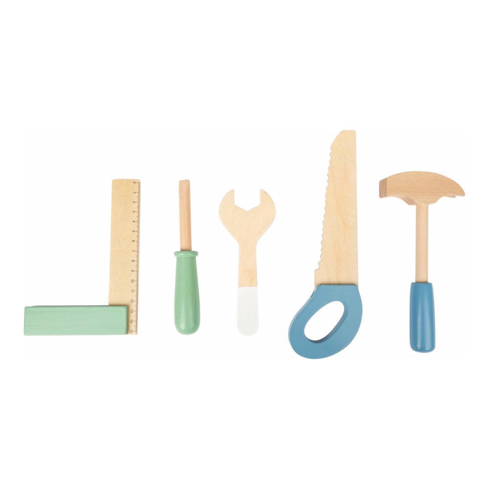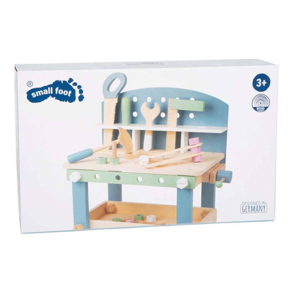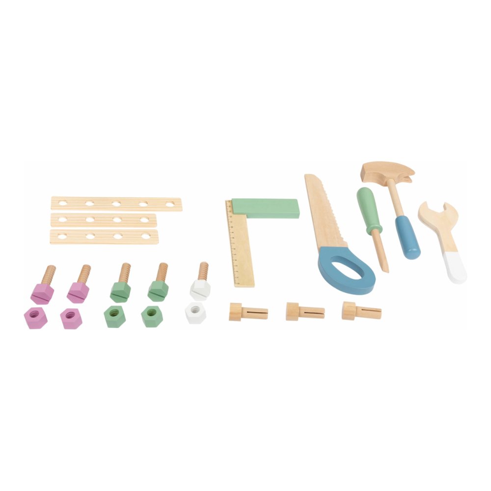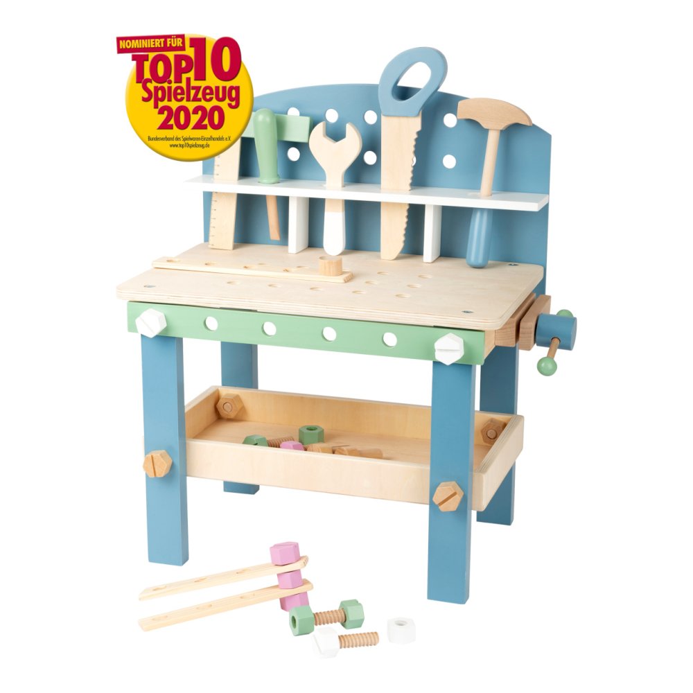 Il video è solo a scopo illustrativo, mostra un prodotto simile.   Colori pastello delicati, belle forme, materiale naturale: questo è il design nordico! Con questo banco da lavoro in legno, i bambini possono imparare le abilità manuali giocando. Contiene 21 accessori: 5 viti, 5 dadi, 3 chiodi, 5 attrezzi e 3 piastre con fori per allenare le capacità motorie fini. I bambini possono aiutare a montare il banco da lavoro e dimostrare così di avere talento per il lavoro manuale. Gli attrezzi e gli accessori possono essere riposti in modo sicuro nel ripiano. Il banco da lavoro con design scandinavo si adatta a qualsiasi casa. È un ottimo giocattolo per ragazzi e ragazze.    Caratteristiche principali Gioco vario su un banco da lavoro compattoBei colori con legno a vista5 attrezzi in legno e morsaI bambini possono aiutare a montare il banco da lavoroFacile stoccaggio di attrezzi e accessori