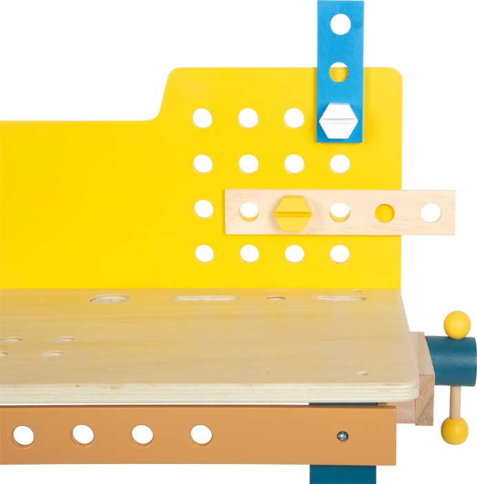 C'è sempre così tanto lavoro in officina! Con questo banco da lavoro compatto con morsa integrata e spazio di stoccaggio, i bambini possono mettere alla prova le loro abilità manuali martellando, segando e avvitando viti. Gli accessori e gli strumenti dal design realistico, tra cui martello, chiave inglese, cacciavite, morsa e sega, portano divertimento durante il gioco e motivano i bambini alla creatività e alla fantasia. La grande quantità di accessori composta da viti, dadi, ingranaggi, set di rondelle e piastre perforate di varie forme e dimensioni consente ai bambini di creare i propri progetti o di costruire una piccola auto da corsa secondo le istruzioni allegate.I fori sulla parte anteriore e posteriore e anche sul piano di lavoro possono essere utilizzati per fissare gli accessori al banco da lavoro con le viti. Giocando con gli attrezzi e grazie al fai-da-te, i bambini allenano le capacità motorie e la coordinazione occhio-mano, imparano a usare gli strumenti in modo giocoso e acquisiscono abilità manuali.  Il set include: banco da lavoro con morsa, martello, chiave inglese, cacciavite, sega, 2 grandi piastre forate, 1 piastra forata media, 2 piccole piastre forate, 2 piastre forate a forma di diamante, 2 piastre forate quadrate, 9 viti, 3 chiodi, 6 dadi, 3 ingranaggi, 2 rondelle sottili e 4 rondelle spesse.  Principali caratteristiche:  insegna ai bambini a usare gli attrezziallena le capacità motorie fini e grossolanesviluppa la coordinazione occhio-mano e l'abilità manualeun ottimo complemento ad altri prodotti delle serie Nordic e Miniwob  Documentazione:  istruzioni di montaggio (DE, EN, FR, IT, ES)istruzioni di montaggio – auto