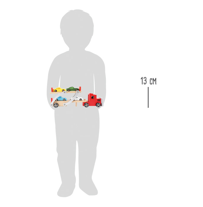 Attenzione, qui si caricano pesi! Se desideri trasportare nuovi modelli di auto dal punto A al punto B, avrai sicuramente bisogno di questo autoarticolato. Si possono caricare quattro auto. Le auto in legno possono salire comodamente sulla rampa di carico. La superficie rialzata dotata di sbarra impedisce l'arretramento indesiderato delle auto. Incluse quattro auto in legno nel design di auto sportive. Il rimorchio si aggancia al trattore e tutto è pronto per un viaggio lungo e sicuro. Ideale per gli appassionati di auto e un ottimo complemento al parco macchine giocattolo nella stanza dei bambini. Principali caratteristiche: realizzato in legno robusto con un design colorato piattaforma superiore mobile per un facile carico e scarico incluse quattro macchinine