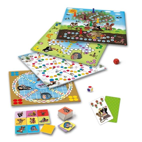 Una volta che avrete accolto in casa il magico Krteček, sarà difficile mandarlo via. I bambini lo ameranno subito e alla fine anche voi cederete al suo fascino. Ad aiutarvi ci sarà anche la confezione di 5 giochi da tavolo con le immagini di Krtek e dei suoi amici. Esercitate la memoria dei bambini con il memory, la tattica con il gioco di carte Score oppure scegliete tra quattro diversi giochi da tavolo, incluso il gioco dell'oca di Krtek. Oltre al divertimento, i bambini affineranno il calcolo, la conoscenza dei colori e, senza dubbio, scateneranno la loro fervida immaginazione. Contenuto della confezione: pedine di gioco in 6 colori (4 pezzi per ogni colore)4 tabelloni di gioco1 dado a punti1 dado colorato30 carte da gioco48 robuste tessere di cartone per il memory Principali caratteristiche: divertimento per tutta la famigliaadatto a bambini dai 3 anni in suProdotto nella Repubblica Ceca