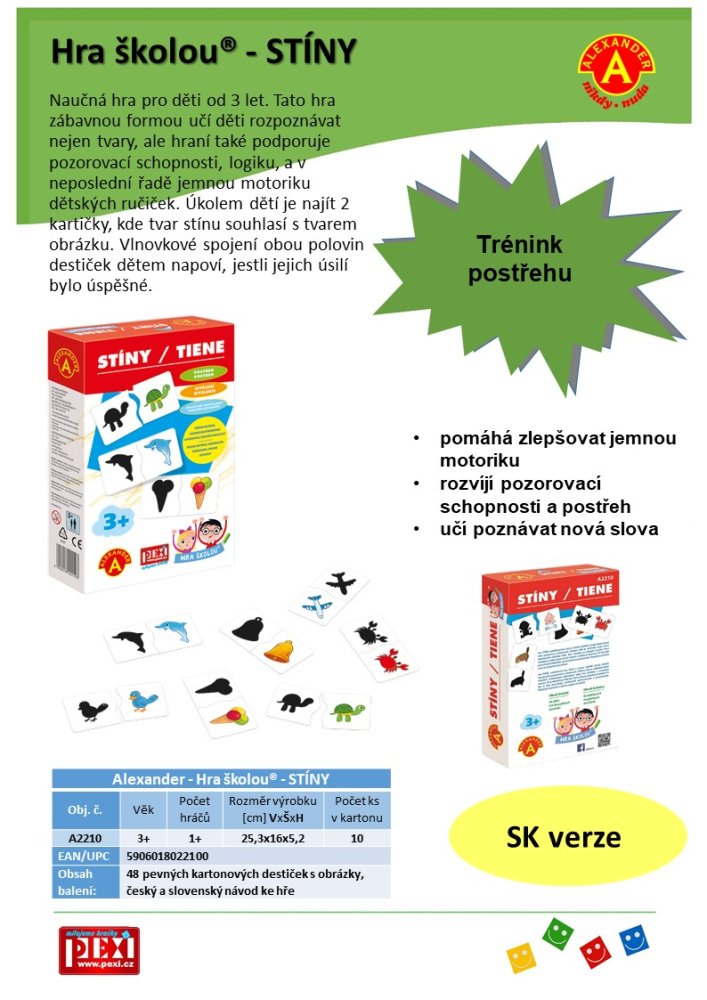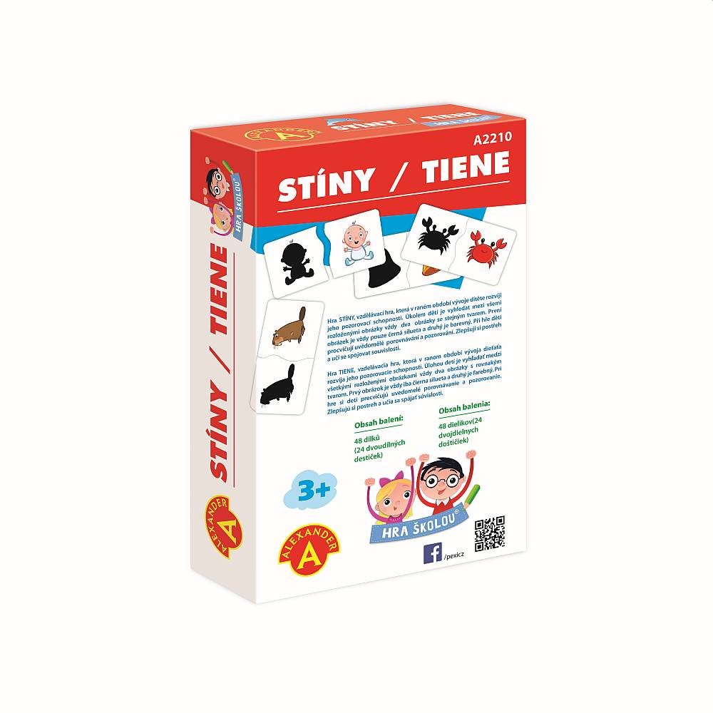 Il gioco Hra školou Stíny è un gioco da tavolo educativo illustrato per bambini dai 3 anni in su che sviluppa capacità di combinazione, osservazione e percezione.  Componi e scopri 24 coppie composte da ombre e immagini colorate di animali, strumenti musicali e oggetti della vita di tutti i giorni. Riconosci gli animali o gli strumenti musicali solo in base al contorno? Componi 24 coppie come un puzzle e continua a giocare.  Gioco preferito della serie Hra školou®.  Divertimento anche per mamme e papà. Che aspetto ha il contorno di un'anatra? In cosa differisce da un pulcino? Esitate? Scoprite il mondo insieme! Quante idee, tante varianti. Man mano che il bambino cresce, il gioco diventa sempre più divertente. Per i più piccoli (dai 3 anni) Lasciate che il bambino componga le coppie e guardi le immagini. Difficoltà media: mostrate animali, strumenti musicali e oggetti specifici dalle immagini e parlatene.  Domande curiose per menti brillanti:  Chiedete e scoprite insieme, ad esempio: Quanti animali trovi tra i motivi? Quali vivono nel mare? Quali oggetti delle immagini abbiamo in casa? Quanti strumenti musicali vedi? Cosa mangiano gli animali raffigurati?   Componi e riconosci tutti i 24 soggetti! In modo divertente, i bambini imparano a riconoscere non solo le forme, ma il gioco supporta anche le capacità di osservazione, la logica e, non da ultimo, le capacità motorie delle mani dei bambini.  Principali caratteristiche:  Divertimento senza fine. Componete insieme le coppie e raccontatevi il più possibile. Per giocare sempre e ovunque. Portate con voi le carte quando andate a trovare qualcuno o nella sala d'attesa. Basta scartare e giocare. Sviluppo di capacità combinatorie, intuizione e osservazione. Il gioco stimola le capacità cognitive dei bambini.   I bambini possono comporre le coppie da soli a partire dai 3 anni circa.