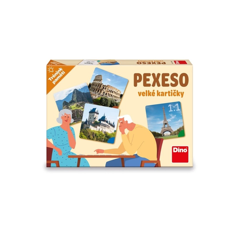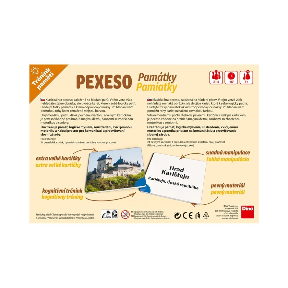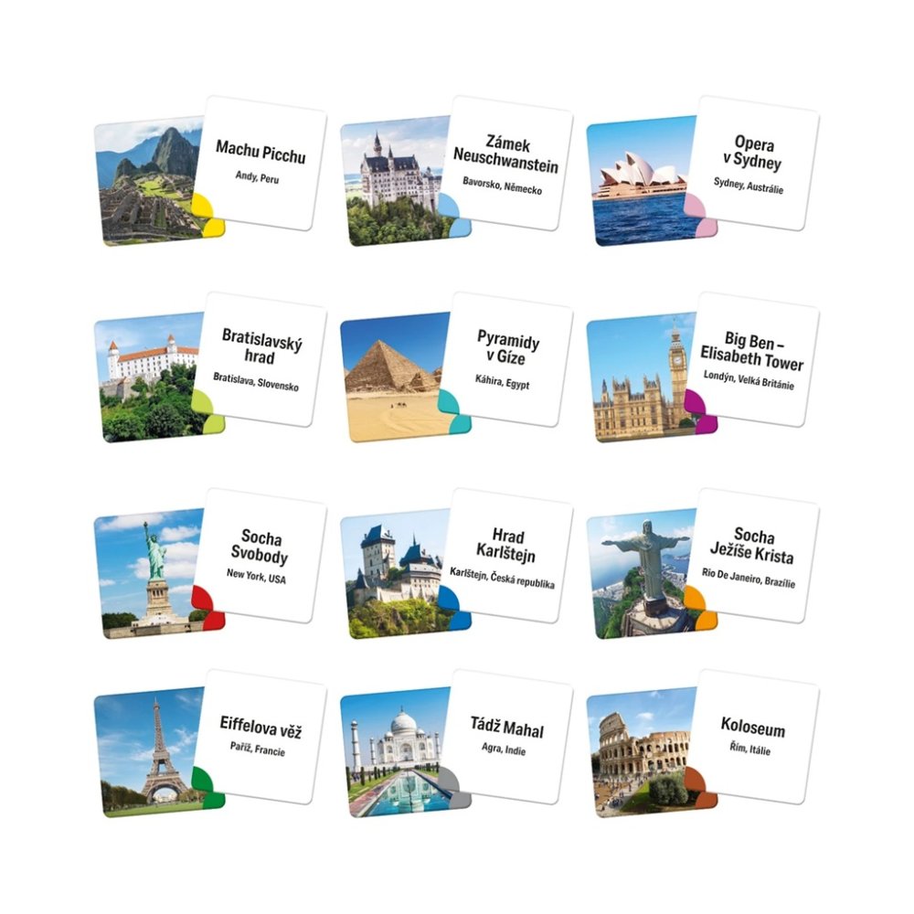 Un gioco classico basato sulla ricerca di coppie. In questa versione, tuttavia, non si cercano le stesse immagini, ma fotografie di luoghi importanti e i relativi nomi. Durante la ricerca, gli angoli delle carte contrassegnati con lo stesso colore ti aiuteranno. Grazie al minor numero di carte, al cartone rigido e alle carte grandi, il memory è adatto per giocare con bambini piccoli, persone con capacità motorie ridotte e anziani. Contenuto della confezione: 24 carteregole Principali caratteristiche: allena la memoria, il pensiero logico e la concentrazioneEsercita le capacità motorie finioffre spazio per la comunicazione e la praticaadatto a bambini dai 7 anni in sunomi dei monumenti in lingua cecaProdotto nella Repubblica Ceca Breve guida al giocoIl Pexeso contiene coppie di carte: un'immagine del monumento e il suo nome. Mescola le carte e disponile a faccia in giù. I giocatori si alternano e girano due carte ad ogni turno. Se formano la coppia corretta, le tengono e continuano a giocare, altrimenti le girano di nuovo. Vince chi raccoglie più coppie.