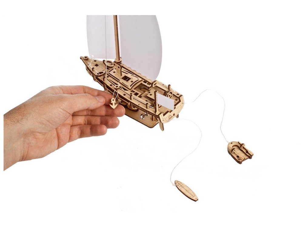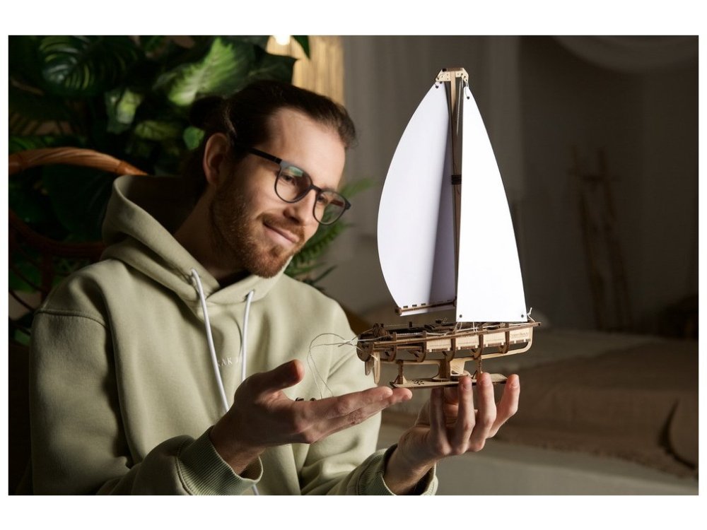 AjdWh3rW0Wc Costruiscimi. Parti con me per una crociera nell'oceano! Cattura il vento, senti la brezza salata, salpa per il mare o fai un viaggio intorno alle isole a bordo dello splendido yacht Ocean Beauty di Ugears. Questo modello 3D in legno di barca a vela è un pezzo di precisione con due vele di carta bianca brillante e viene fornito con il proprio robusto supporto per l'esposizione su una mensola, un caminetto o una scrivania. Il modello è un po' diverso dagli altri modelli meccanici Ugears in quanto lo yacht non ha ingranaggi e non è alimentato da un motore a molla o in gomma: è inteso piuttosto come un bell'oggetto da esposizione per decorare la tua casa o il tuo ufficio. Questo modello in legno di yacht fai-da-te ha una vela principale curva con un boma oscillante e un fiocco triangolare, entrambi fissati a un albero alto con un sartiame di crocetta per sartie di dritta e di sinistra. Il ponte è fiancheggiato da montanti e ringhiere di corda. Due giubbotti di salvataggio e un'ancora aggiungono ulteriori elementi realistici alla barca. A poppa c'è un albero per issare la bandiera dello yacht: lascia la bandiera di carta bianca pulita, colorala o applica un adesivo o una stampa di qualsiasi bandiera nazionale o bandiera di un club velico. Questo modello in legno di yacht con puzzle 3D ha un grande pozzetto con due ruote che girano (è Ugears, quindi dobbiamo avere alcune parti mobili!) e uno specchio di poppa aperto per lo scarico dell'acqua di mare quando vieni sorpreso da un'onda a poppa in mari agitati, oppure vedi una grande onda a prua che spazza il ponte. Lo specchio di poppa aperto è anche ottimo per nuotare dalla parte posteriore o per salire e scendere da un modello di barca, trainato dietro lo yacht su una fune (incluso). La barca è dotata di remi in miniatura e può ospitare una figurina a tua scelta (non inclusa). C'è anche una tavola da surf che può essere trainata per divertimento o nel caso in cui tu trovi un'onda fantastica vicino alla riva. Lo yacht decorativo Ocean Beauty viene fornito con un robusto supporto in cui la nave scivola dentro. Per fissare lo yacht per un'esposizione sicura, è sufficiente spingerlo in avanti in modo che la chiglia si blocchi nella fessura del supporto. Quando si desidera ammirare il modello da vicino, farlo scorrere indietro ed estrarlo facilmente! Lo Yacht Ocean Beauty è la nave gemella del trimarano Merihobus come modello di barca a vela Ugears e si unisce alla nave da ricerca e al rimorchiatore Ugears nella nostra crescente flotta di modelli di navi e barche in legno. Lo yacht ha solo 95 parti e il suo assemblaggio è valutato come "facile", quindi è un ottimo kit di partenza per i principianti. Non è necessaria colla o strumenti speciali per la costruzione. Il kit include un manuale illustrato dettagliato in 11 lingue (inglese, tedesco, ucraino, francese, polacco, spagnolo, portoghese, italiano, giapponese, cinese e coreano) per assisterti nell'assemblaggio. Lo Yacht Ocean Beauty è un ottimo regalo per ogni appassionato di vela o modellista tra i tuoi amici e familiari. Oppure perché non regalare un nuovo hobby, perché anche i principianti possono costruire questo semplice puzzle 3D. Si dice che una barca sia un buco nell'oceano in cui vengono gettati i soldi, ma questo bellissimo modello di yacht ti permetterà di vivere un sogno nautico per pochi soldi! Principali caratteristiche: 95 pezzi tagliati con precisionesemplice difficoltà di assemblaggiopiccoli dettagli meccaniciprogettato e prodotto in Ucraina