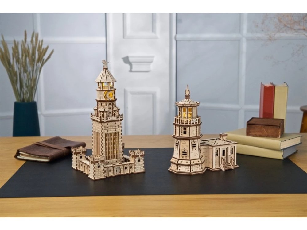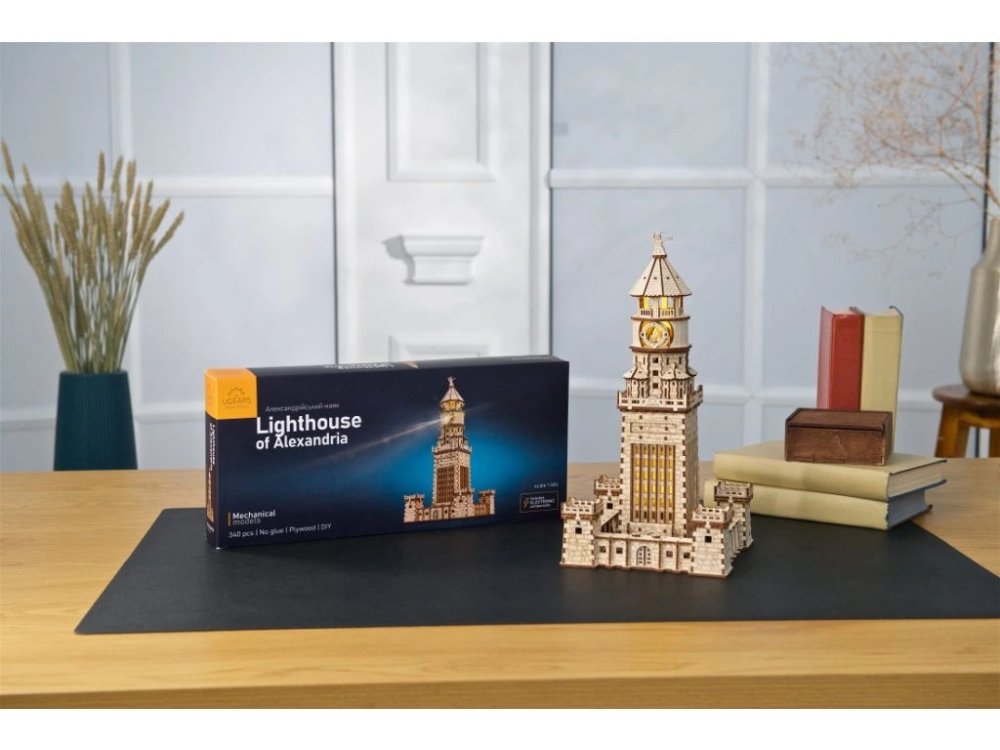 Rivivi la storia costruendo il faro di Alessandria. Il modello è dotato di luci a LED e componenti elettrici che illuminano il faro dall'interno, rendendolo allo stesso tempo una decorazione bella e funzionale per il tuo comodino. Il modello in legno del faro di Alessandria è un'affascinante replica pronta per essere assemblata. Poiché il faro di Alessandria era dedicato a Zeus, il nostro modello è sormontato da un intaglio inciso del re degli dei che stringe un fulmine. I diversi dettagli conferiscono all'intero oggetto un interesse architettonico e l'incisione laser imita l'aspetto di blocchi di pietra e scandole. Il modello ha anche una parte mobile: cancelli nella base anteriore e posteriore che si aprono con manopole rotanti. Dotato di istruzioni dettagliate per l'assemblaggio. Principali caratteristiche: 340 pezzi tagliati con precisionedifficoltà di assemblaggio mediacomponenti elettrici – cavo USB-C e batterie 3xAA non inclusi nella confezioneprogettato e prodotto in Ucraina