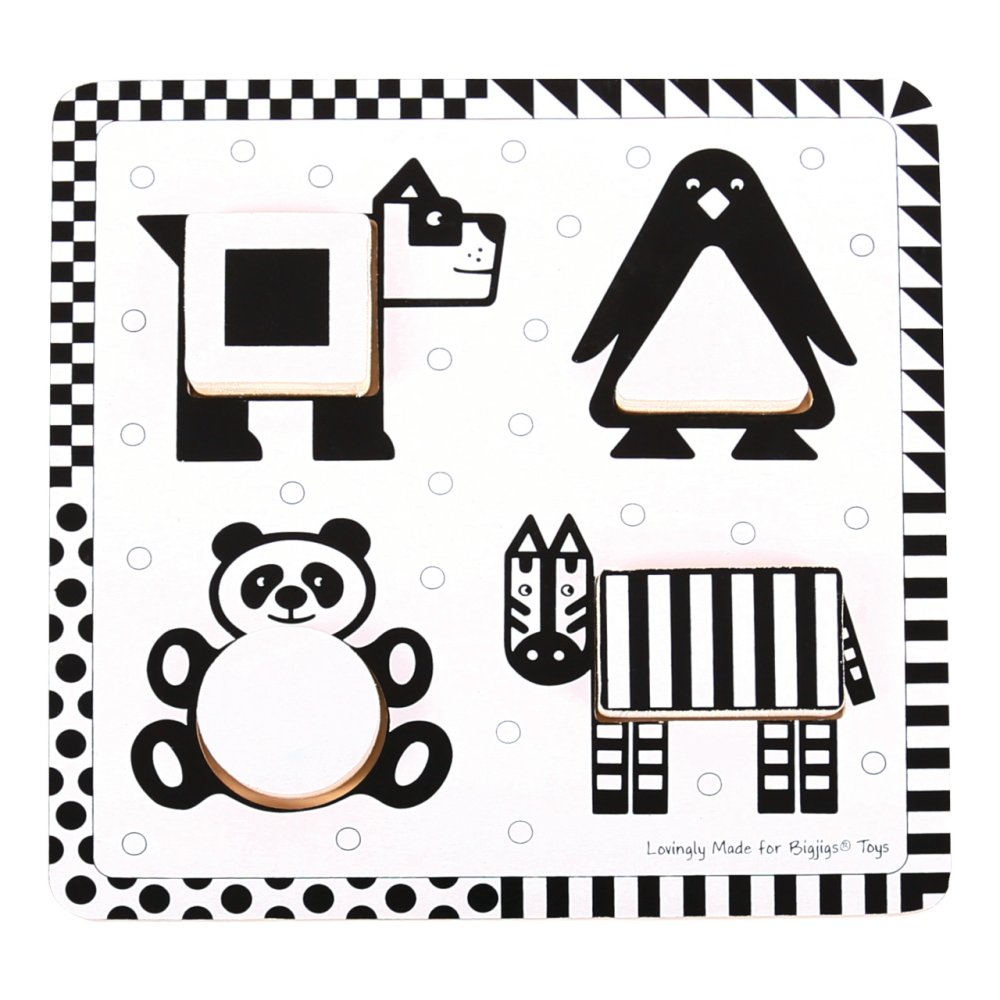 Questo puzzle in legno è stato appositamente progettato in bianco e nero perché il bianco e nero sono i colori più facilmente riconoscibili dai bambini piccoli e a cui reagiscono. Ciascuno dei quattro pezzi del puzzle può essere inserito nel posto sul tabellone con l'illustrazione di animali e aiuterà il tuo bambino nello sviluppo quando imparerà a identificarli e posizionarli. Ogni massiccio pezzo di puzzle in legno ha dimensioni generose per essere facilmente sollevato, afferrato, esplorato e scambiato dalle piccole mani. Aiuta a sviluppare la manualità, le capacità sensoriali e la concentrazione. Realizzato con materiali di alta qualità, provenienti da fonti responsabili. Conforme alle attuali norme di sicurezza europee. Contiene 4 pezzi di puzzle. Principali caratteristiche:  appositamente progettato per i bambini più piccolicontiene 4 pezzi di puzzlesviluppa la manualità, le capacità sensoriali e la concentrazione