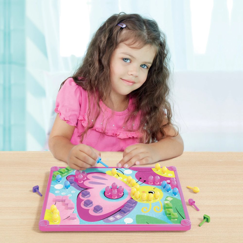 Mosaico a pioli con cestino portaoggetti e 4 schede illustrate prestampate per l'inserimento dei pioli. Mosaico che sviluppa la motricità fine, la coordinazione occhio-mano e il pensiero creativo. Composto da 4 schede perforate prestampate, 180 pioli colorati, base per l'inserimento, telaio di supporto e cestino portaoggetti. Consigliato per bambini dai 3 anni in su. Contenuto della confezione:1 cestino portaoggetti1 base per l'inserimento con fori per i pioli1 telaio di supporto4 schede perforate con immagini180 chiodini colorati da inserire in 2 forme e 6 colori Principali caratteristiche: supporta le capacità motorie finicoordinazione occhio-manopensiero creativo