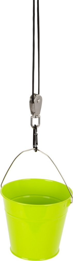 Nella casetta da giardino, nella casa sull'albero, sulle strutture da arrampicata o ovunque! Con questo paranco con corda robusta e secchio di metallo, i giovani avventurieri possono trasportare qualsiasi carico in questi luoghi elevati menzionati e di nuovo giù. Così i bambini non devono arrampicarsi su e giù ripetutamente. È un giocattolo divertente che allena la manualità. L'orecchio in metallo è progettato in modo che il moschettone con la corda non si sposti. I bambini impareranno come funziona un paranco e saranno in grado di spostare facilmente carichi pesanti. Giocattolo perfetto per il giardino.