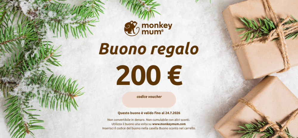 Il buono regalo può essere utilizzato una volta per un acquisto di un determinato valore o più sul sito www.monkeymum.com. Il buono non è riscattabile in denaro.