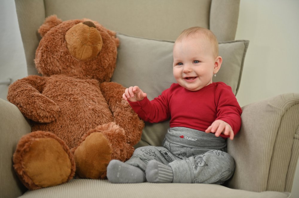 Il corpo a maniche lunghe in tessuto a maglia spessa è perfetto per i mesi freddi. È adatto come strato di base quando ci si veste fuori, ma in combinazione con pantaloni della tuta o tutine può essere indossato anche a casa. Il body è realizzato in un materiale elastico e confortevole che si adatta a diverse taglie. Le mamme apprezzeranno sicuramente la chiusura con bottoni automatici sul collo e sul cavallo, che rende il body molto facile e veloce da indossare. Per la produzione di questo body è stato utilizzato il materiale Outlast® in una variante ad anello, che è liscia sul davanti e ha anelli sul rovescio. Il materiale Outlast® è in grado di regolare la temperatura corporea, di allontanare il calore in eccesso e di prevenire la sudorazione durante l'uso. Nel momento in cui la temperatura corporea scende, il materiale Outlast® rilascia il calore accumulato e inizia a riscaldare il corpo. L'abbigliamento in materiale Outlast® è molto apprezzato per le sue proprietà termoregolatrici, in quanto garantisce il comfort termico per tutto il tempo in cui viene indossato. Il body a maniche lunghe è adatto per i mesi autunnali, invernali e primaverili.