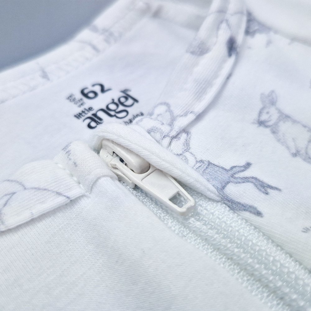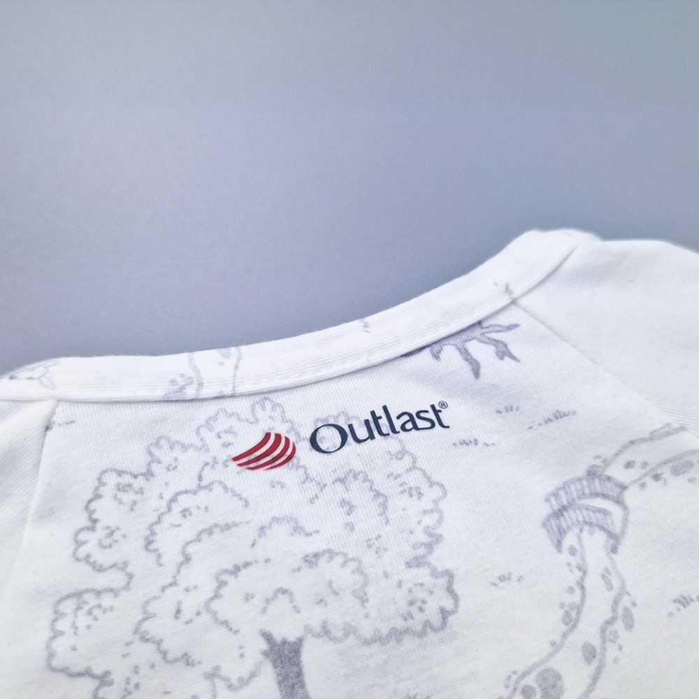 La tutina è realizzata in maglia di cotone con materiale termoregolante Outlast®, che crea le condizioni di temperatura ideali e mantiene una temperatura costante tra la pelle e il tessuto.