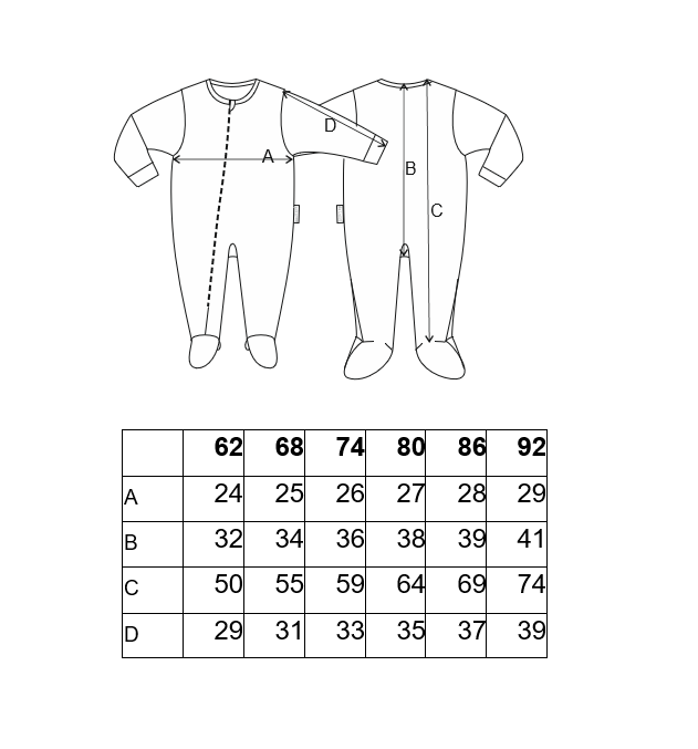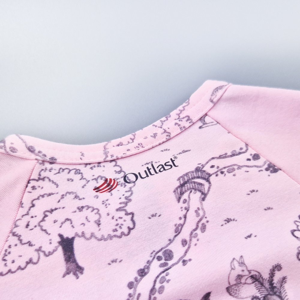 La tutina è realizzata in maglia di cotone con materiale termoregolante Outlast®, che crea le condizioni di temperatura ideali e mantiene una temperatura costante tra la pelle e il tessuto.