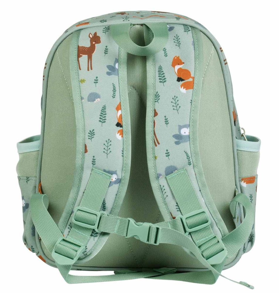 Lo spazioso zaino per bambini verde menta con stampa di animali del bosco è ideale per l'asilo o per i viaggi. Lo zaino è dotato di un ampio scomparto principale e una tasca frontale isolata per snack e bevande. Una borraccia può essere inserita in una delle due tasche laterali. Pratici gli spallacci imbottiti e la cinghia pettorale antiscivolo impediscono che scivoli dalle spalle. Il pannello posteriore imbottito offre maggiore comfort ed è realizzato in tessuto traspirante. Non è consigliabile lavare lo zaino; è sufficiente pulirlo con un panno umido. Dimensioni: 27 x 32 x 19 cm Capacità: 16 litri Materiale: Poliestere e PEVA