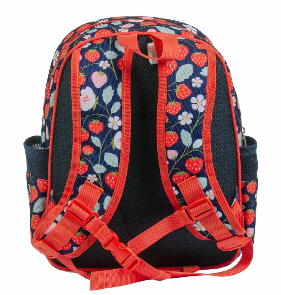 Questo spazioso zaino per bambini blu scuro con stampa di fragole è perfetto per la scuola o per i viaggi. Lo zaino è dotato di un ampio scomparto principale e una tasca frontale isolata per snack e bevande. Una borraccia può essere inserita in una delle due tasche laterali. Pratici gli spallacci imbottiti e la cinghia pettorale antiscivolo impediscono che scivoli dalle spalle. Il pannello posteriore imbottito offre maggiore comfort ed è realizzato in tessuto traspirante. Non è consigliabile lavare lo zaino; è sufficiente pulirlo con un panno umido. Dimensioni: 27 x 32 x 19 cm Capacità: 16 litri Materiale: Poliestere e PEVA
