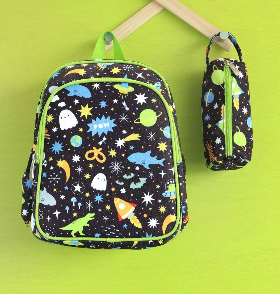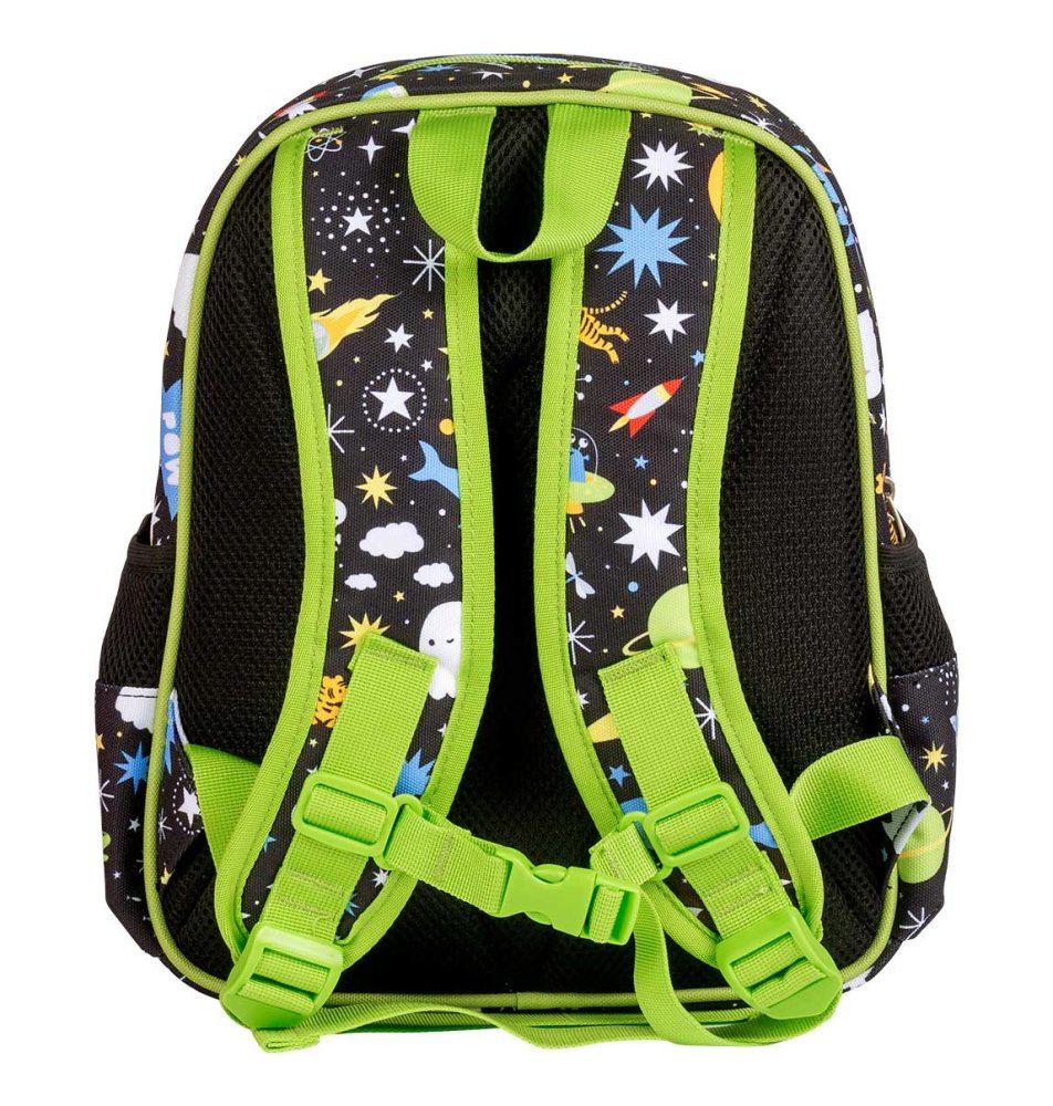 Lo spazioso zaino nero per bambini con razzi, pianeti e stelle è ideale per l'asilo o per i viaggi. Lo zaino è dotato di un ampio scomparto principale e una tasca frontale isolata per snack e bevande. Una borraccia può essere inserita in una delle due tasche laterali. Pratici gli spallacci imbottiti e la cinghia pettorale antiscivolo impediscono che scivoli dalle spalle. Il pannello posteriore imbottito offre maggiore comfort ed è realizzato in tessuto traspirante. Non è consigliabile lavare lo zaino; è sufficiente pulirlo con un panno umido. Dimensioni: 27 x 32 x 19 cm Capacità: 16 litri Materiale: Poliestere e PEVA