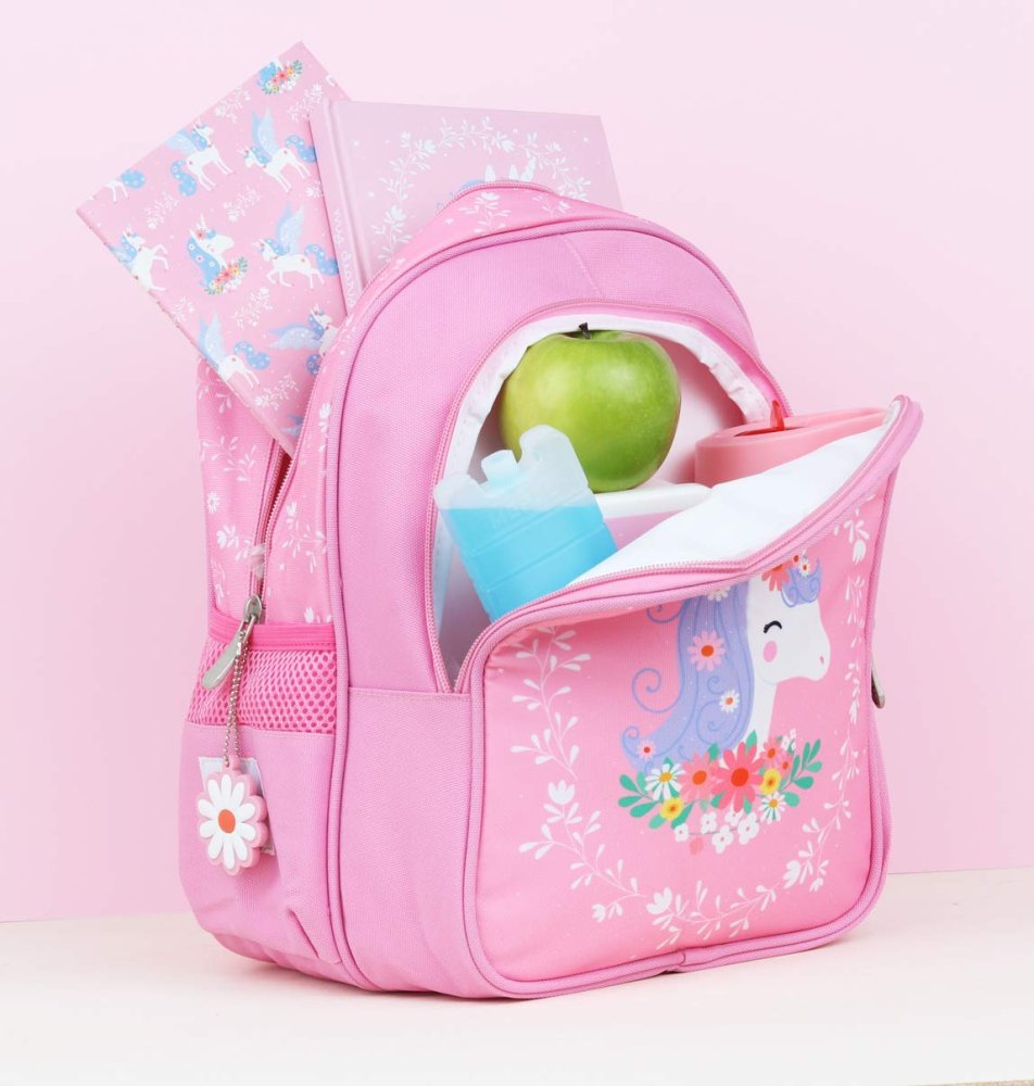 Lo spazioso zaino rosa per bambini con stampa di unicorno è ideale per la scuola o per i viaggi. Lo zaino è dotato di un ampio scomparto principale e una tasca frontale isolata per snack e bevande. Una borraccia può essere inserita in una delle due tasche laterali. Pratici gli spallacci imbottiti e la cinghia pettorale antiscivolo impediscono che scivoli dalle spalle. Il pannello posteriore imbottito offre maggiore comfort ed è realizzato in tessuto traspirante. Non è consigliabile lavare lo zaino; è sufficiente pulirlo con un panno umido. Dimensioni: 27 x 32 x 19 cm Capacità: 16 litri Materiale: Poliestere e PEVA